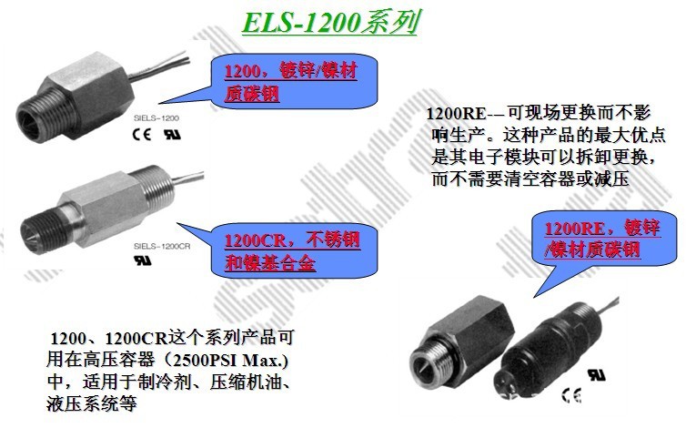 Gems ELS-1200光电液位开关系列产品可用在高压容器(2500PSI Max.) 中,适用于制冷剂、压缩机油、液压系统等