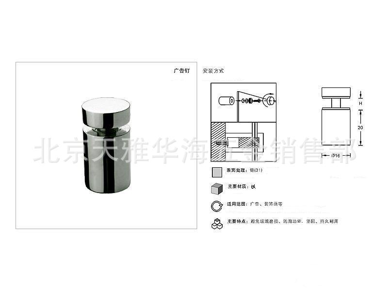 广告钉,表面镀铬(即亮光),材质铁,实心。大量适用于广告牌的固定、展示,应用范围广阔。广告钉是一种多功能的五金配件,规格有很多种。