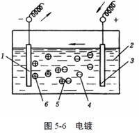 在硫酸溶液中插入两个电极,以零件为阴极,铜板为阳极(见图5-6),接通直流电源,这时电解液中正离子(铜离子)就向阴极运动,达到阴极后,在阴极上取得本身所缺少的电子,转变为中性的铜原子附着在阴极上;同时,负离子(酼酸根离子)向阳极运动,与阳极的铜板起化学反应为硫酸铜。硫酸铜又被水溶解,补充电解液中失去的离子。通过连续的化学反应,零件表面镀覆上一层铜。这就是电镀的基本原理。