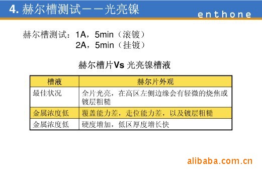 (2)镍电镀液:在指定的赫尔槽中加入267ml镍的电镀液,插上气泵使溶液搅拌均匀并同时用加热器把溶液加热到50℃.去除赫尔槽实验片上的薄膜,用水冲洗,然后放入10%的硫酸中浸泡30秒,取出,再用水冲洗,然后放入赫尔槽中.连接赫尔槽电源,用2A的电流持续通电20分钟.电镀结束后在把赫尔槽实验片取出,用水冲洗,然后放入0.1%的BT-120中浸泡30秒,取出用气吹干.完成实验后,保存结果,报告上司.