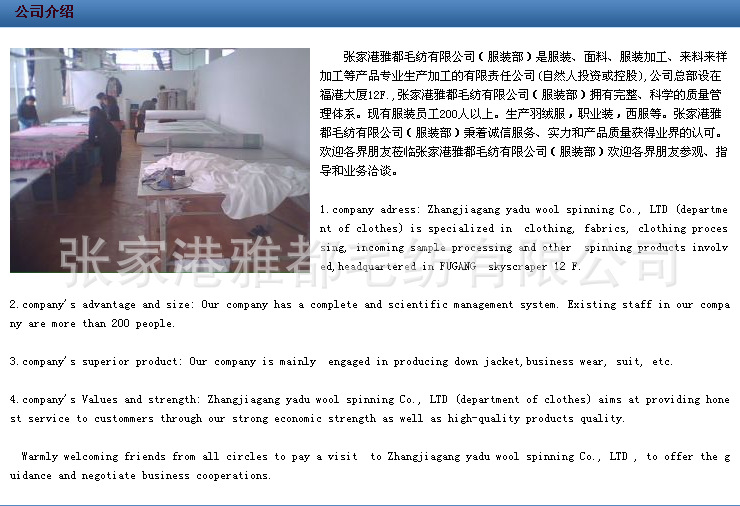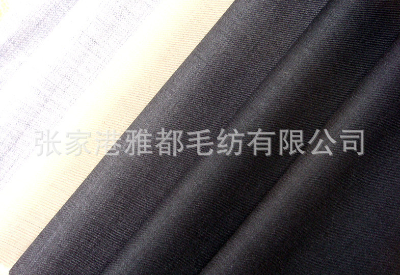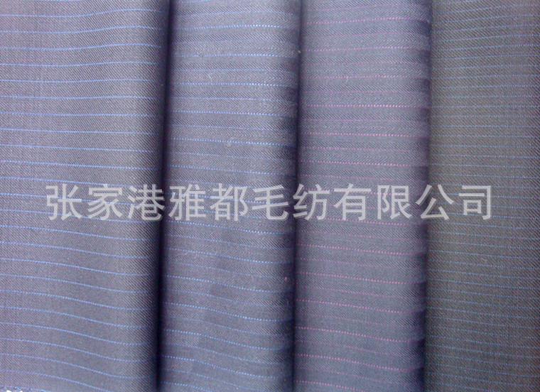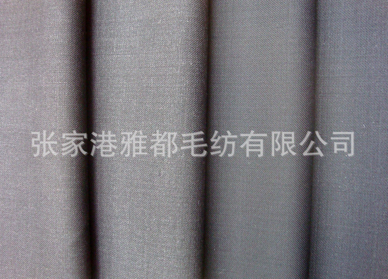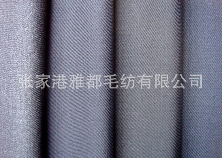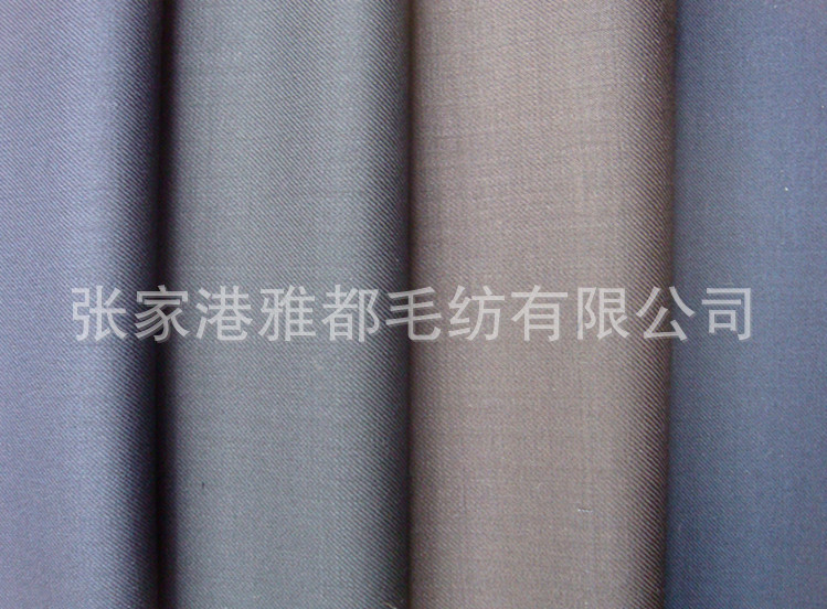 雅都毛纺公司专业从事精纺面料,精纺毛料的加工定做销售服务。公司的主要精纺面料品种有,板司呢,花呢,华达呢,哔叽,贡丝绵,舍味呢,西装面料,凡立丁,派力司,女士呢等等,价格公道,品种齐全,欢迎广大新老客户来厂洽谈合作,打样,下单,做大货,实现双赢,利益共享.