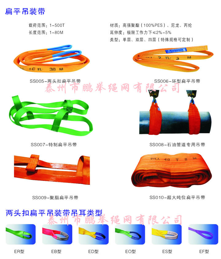 主要产品有:化纤吊带/扁平丙纶吊装带/涤纶吊装带/柔性吊带/环形柔性吊带/耐酸吊装带/耐碱防腐吊带/石油管道专用吊带/石材起重吊带/防割型吊装带/镀锌专用吊装带/工程警示带/耐酸吊带;酸洗吊装带;耐碱吊带;环形吊带;聚酯吊带,尼龙吊索