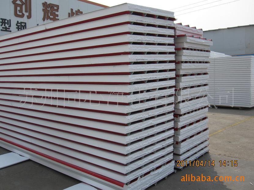 聚苯乙烯泡沫塑料夹芯板是由彩色钢板作表层,闭孔自熄型聚苯乙烯泡沫塑料做芯材,通过自动化连续成型机将彩色钢板压型后用高强度粘合剂粘合而成的一种高效新型复合建筑材料,主要适用于公共建筑、工业厂房的屋面、墙壁和洁净厂房以及组合冷库、楼房接层、商亭等,它具有保温、防水一次完成,施工速度快、经久耐用、美观大方等特点聚苯乙烯夹芯板有十多个品种,4条生产线,采用工业电脑PLC变频控制,年生产能力达200万平方米,产量居国内之首。