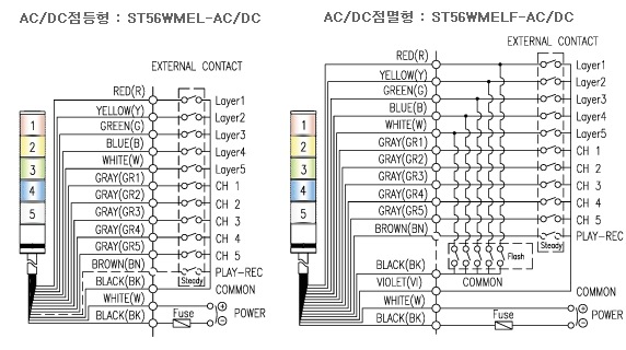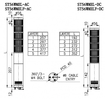 ST56WMEL ST56WMELF | 1-1层 2-2层 3-3层 4-4层 5-5层 | WS警告音 WM音乐音 WA提示音 WV声音信号 | 12-DC12V 24-DC24V 110-DC110V 220-DC220V | ■红: R ■黄: A ■绿: G ■蓝: B ■白:W |