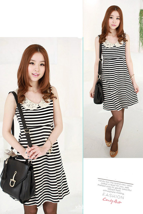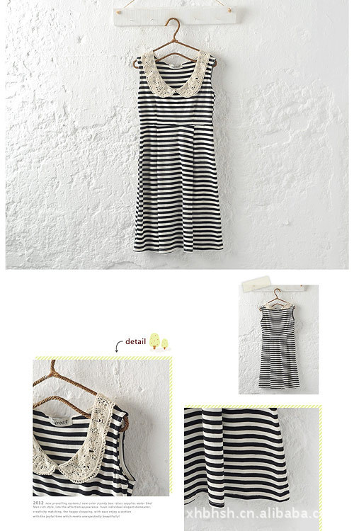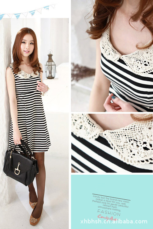 2012夏装新款钩织领伞状条纹修身优雅无袖连衣裙韩批发