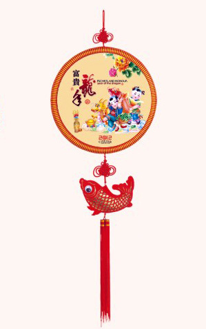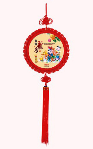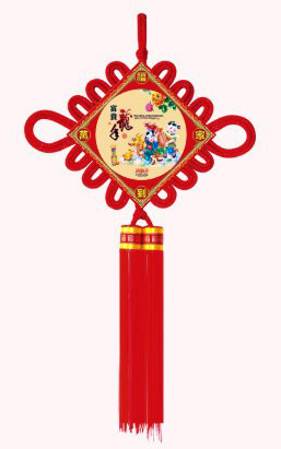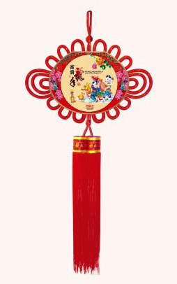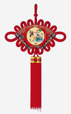中国结:把不同的结饰互相结合在一起,或用其它具有吉祥图案的饰物搭配组合,就形成了造型独特、绚丽多彩、寓意深刻、内涵丰富的中国传统吉祥装饰物品。