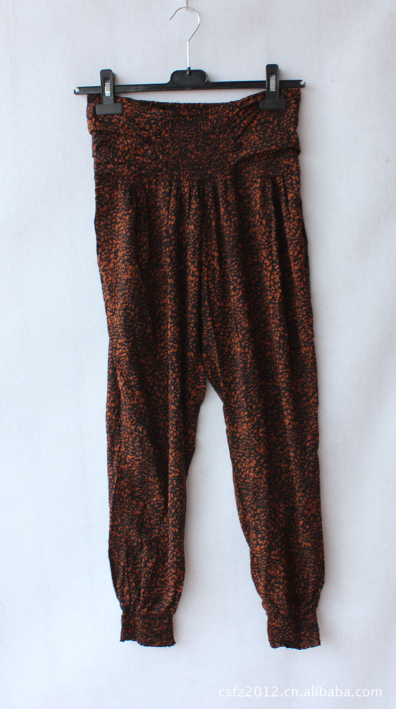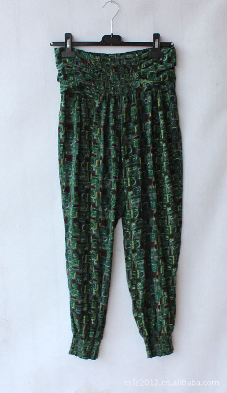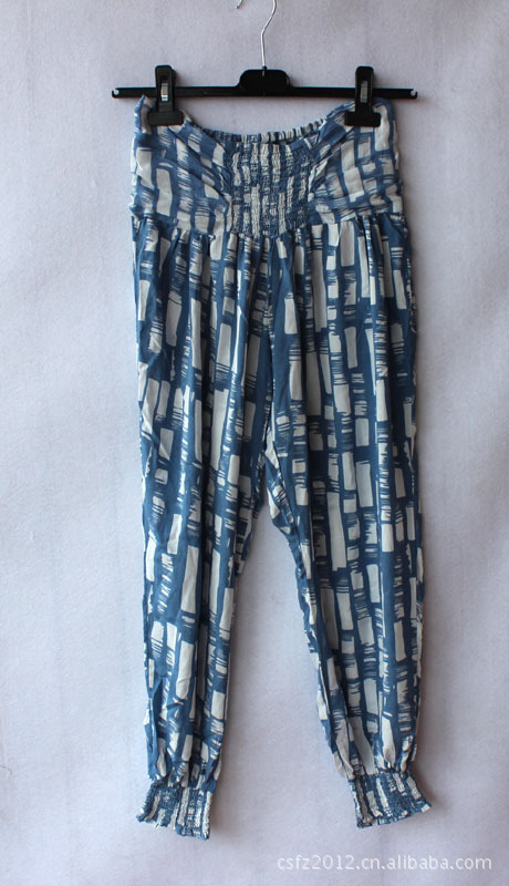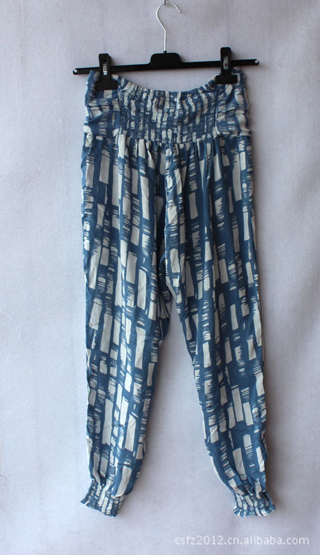面料是人棉的,穿起来很舒服。腰的中间和裤脚有松紧,胖瘦都好穿
