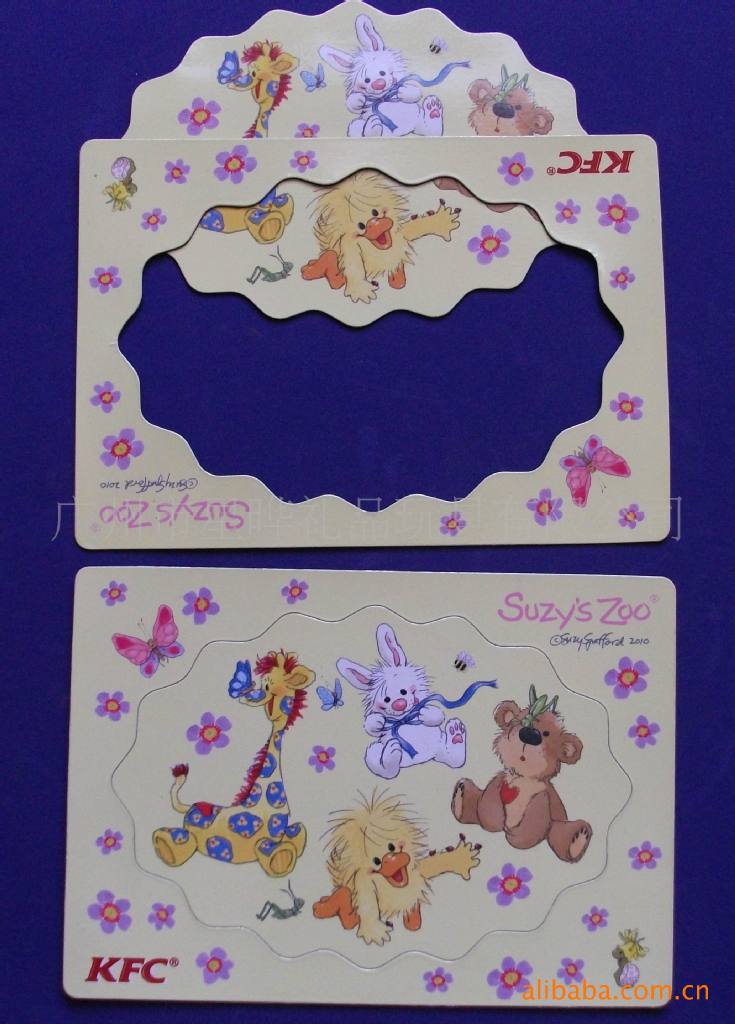 7)磁性拼图(纸板拼图):采用下面软胶磁铁(或纸板灰板纸)+上面铜版纸四色印刷裱光膜,中间冲切设计需要的拼图小片来制作而。