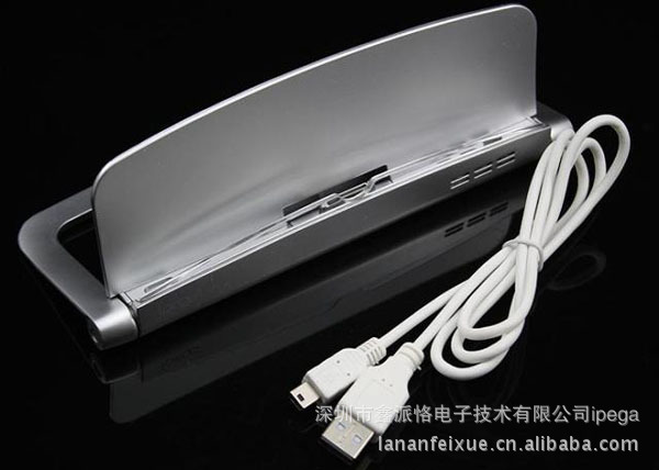 通过本产品配套的USB转接线连接iPad原装火牛,再将转接线的另一头接入产品背面的小5P USB母座。顺利上电后支架亮蓝光,并且开始对iPad主机进行充电。
