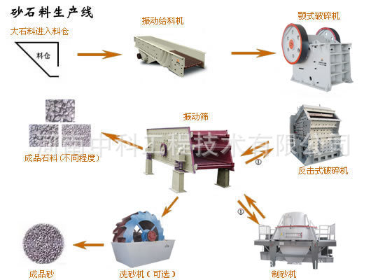 石料生产线的流程大致为:(料仓)----给料机----颚式破碎机----反击式破碎机----振动筛----(可成成品)。其中间的机器之间可用输送机相接。