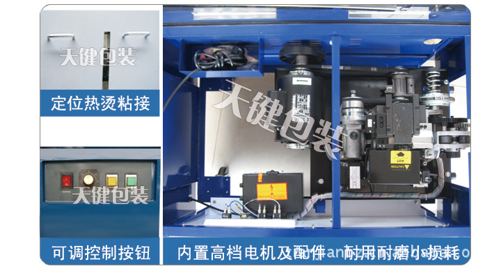 这款打包机是在国外样机的基础上改进设计制造而成,使用范围广,不但适用 于不同大小产品的包装,而且不用调整机器就可以打包,该机属机械式结构,部 分采用进口原产配件,后刀刃稳定可靠,具有操控简易,调整方便的特点。 *新型集成电路:采用接入式PC板控制整个打包动作。 *超静音设计:整机组合完善成熟,电磁离合,连轴式传动,继而达到减轻工 作压力, 速率快,运转无声,磨损小,故障率低。 *瞬间加热:速热系统热熔设计,仅输出1V低电压安全性高,仅需10秒内加热,就 可进入最佳打包状态。 *自动停止、省电实用:捆包动作完成后60秒内马达自停处待机状态. *新一代电热钢片设计:可避免变形短路此类故障出现。 *包装适用范围广:市场任何机用打包带,且带宽6m~15m,粘合效果最佳.