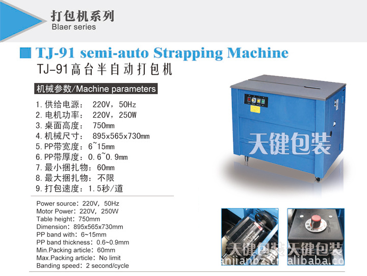 半自动高台打包机广泛适用于家电、食品、陶瓷、照明、电器配件、服装、邮政等