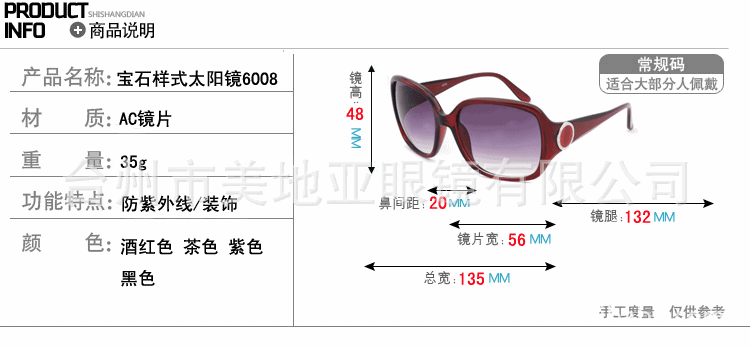 浅色太阳镜对太阳光的阻挡作用不如遮阳镜,但其色彩丰富,适合与各类服饰搭配使用,有很强的装饰作用。浅色太阳镜由于其色彩丰富、款式多样,受到了年轻一族的青睐,时尚女性对其更是宠爱有加。特殊用途太阳镜具有很强的遮挡太阳光的功能,常用于海滩、滑雪、爬山等太阳光较强烈的野外,其抗紫外性能等指标有较高的要求。