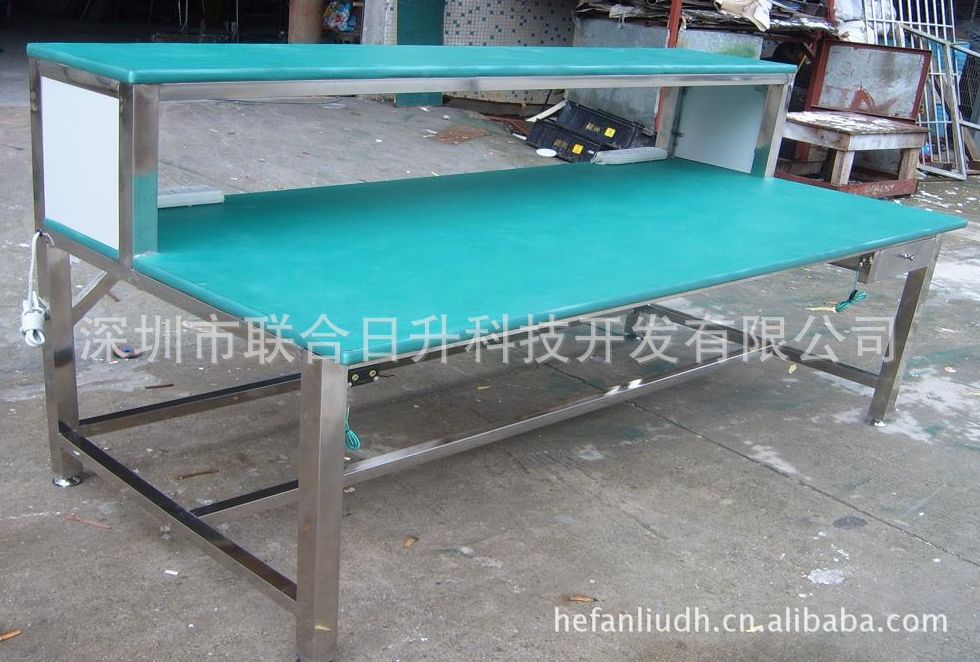 整体由不锈钢201焊接制造,板面为1.2mm不锈钢板,配置16mm刨花板加贴2mm防静电台垫,接地线,插线板等。