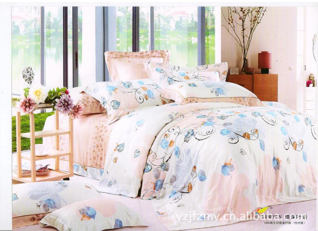 【产品名称】:采用的是高档竹纤维面料,全套产品由被套、被单、床笠、床盖、短枕套(4个)、靠枕套(2个)、小