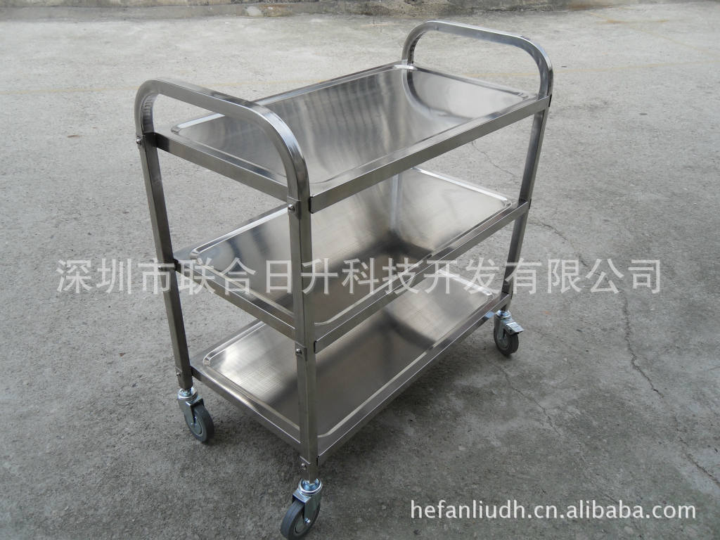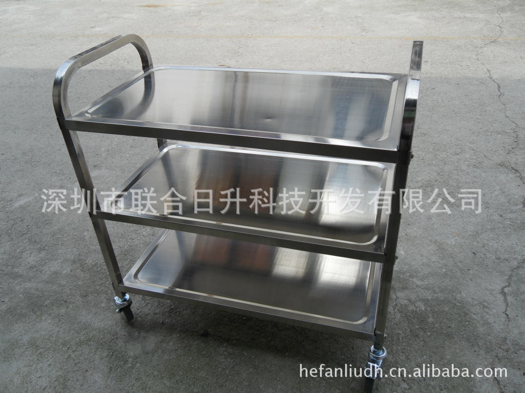 推车层距均分,不锈钢扶手均匀打孔,可均匀分布不锈钢车每层面板层距,每层由不锈钢螺丝固定在扶手上,车身四角配4寸万向脚轮。可组装式不锈钢推车,质量可靠,做工精美,方便快捷,价格优惠,欢迎全国各地有需求的客户来电订做,具体规格有以下三种。