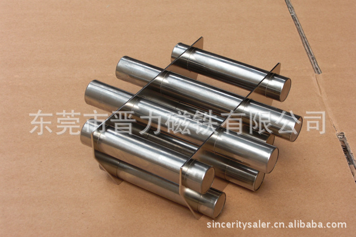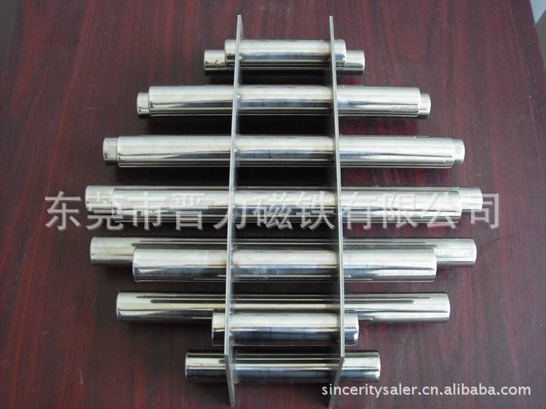 磁力棒规格(∮22、∮25、∮28、∮32、∮38.....)产品是经过5道工序精致而成. 磁力棒由内部的磁芯和和外部的包层组成,磁芯又包括圆柱磁铁块和导磁铁片组成。磁力棒全部配置不锈钢保护套,有效保护磁力棒不易受损。排铁方便快捷;拉动磁力棒,吸附在磁力棒的铁磁性物质自动分离落下。连续工作;逐层抽出排铁时原料可继续工作,无须暂停进料。
