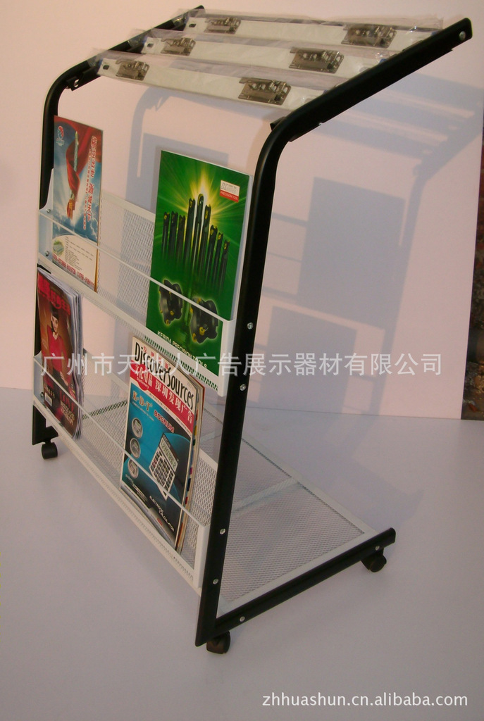 材质:椭圆铁管烤黑漆,四层加宽网片喷涂黑色,单层可放两本A4资料书;做工精致,焊接位平滑,组装简易,陈列稳定,配有万向轮.