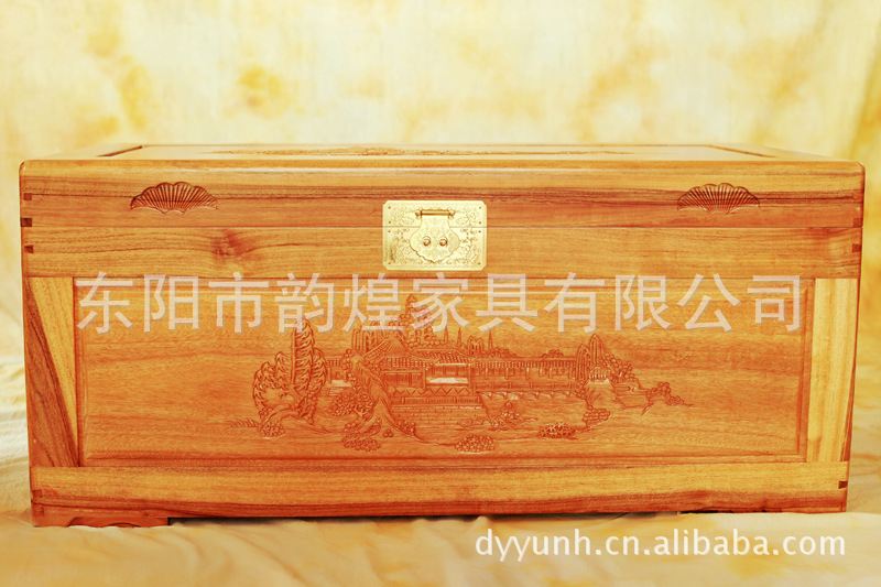 东阳韵煌家具生产的樟木箱集东阳木雕之精华, 取明清家具之风格时期。作品图案优美、结构精巧、生动逼真、做工雕刻精细,是您购买樟木箱的最佳选择 。