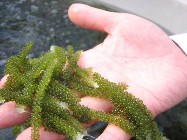 海葡萄(Caulerpa lentillifera)属绿藻门,原产于东南亚的菲律宾、马来西亚、印尼及日本的冲绳等地。海葡萄富含矿质元素,在东南亚国家常常被做成沙拉生食,具有美容强身的功效。相关的研究报道表明,海葡萄具备抗御细菌与真菌的特性,常被用于治疗高血压与风湿症。海葡萄是高经济作物,有“绿色鱼子酱”美名。