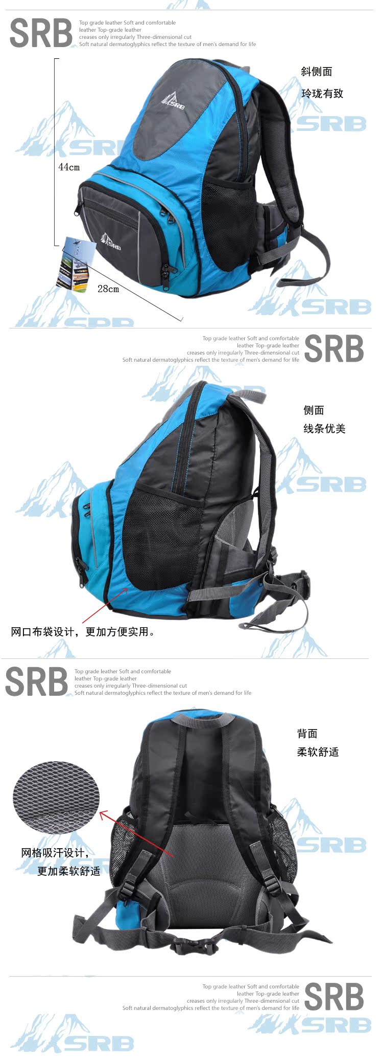 【面料】:420D防水,丝绒弹力布,防撕裂防磨透气网