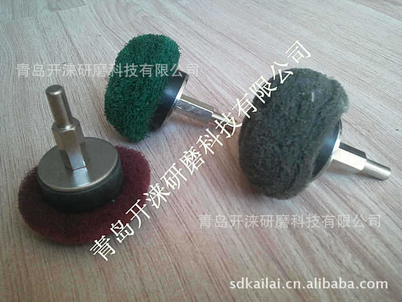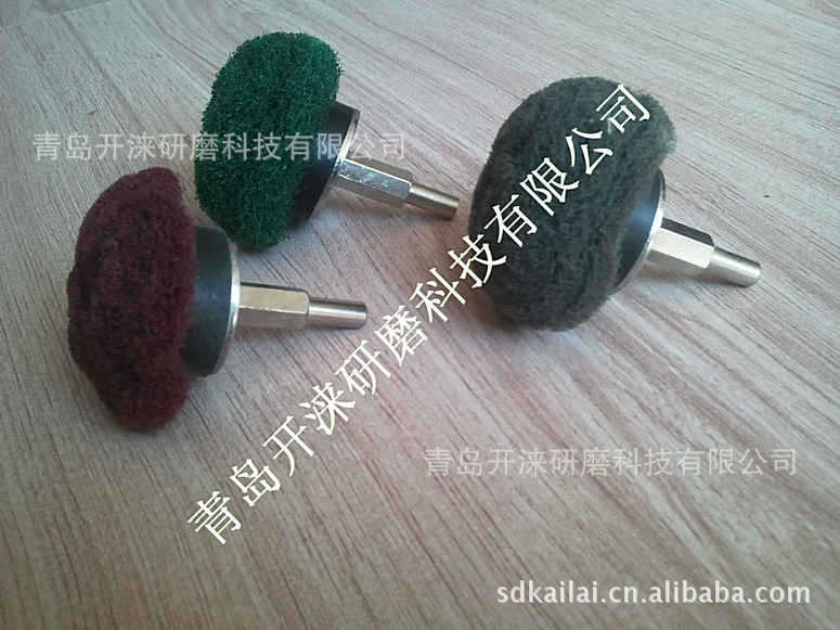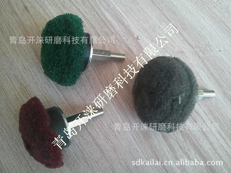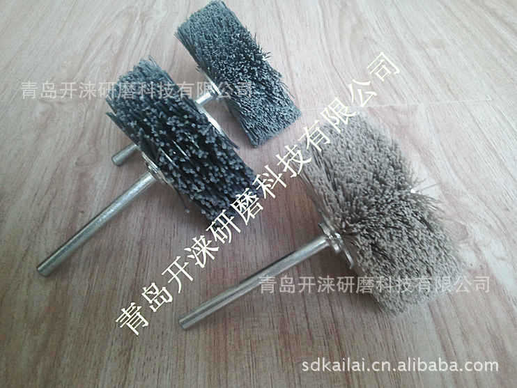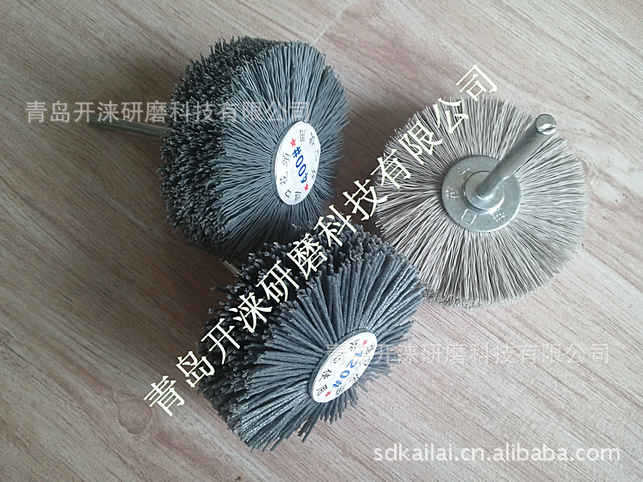 带柄磨料丝抛光花头将磨料丝紧密排列在一起,然后放到特定的模具中用钢片通过冲压机制成一片一片的刷轮,在制做刷辊时可以将多片刷轮串连在一起固定在辊轴上,这种工艺制成的毛刷的刷丝密度可以做到最高,但缺点就是造价较高,而且制做时效率慢。磨料丝毛刷轮适用于铜、铝、铁、锡等各种高端工件精密金属零件、汽摩配件、电脑配件、通用零件部件、五金工具精整、抛光、去毛刺等各种表面研磨和清洗,在酸性、碱性水,油污等各种特殊环境研磨、清洗不影响使用效果、不断丝、高效率、无污染、使用灵活,寿命是普通钢丝轮刷的数倍,是各种高端零部件的首选产品,在凹凸雕刻曲面磨削可完全可替代砂纸、砂盘等研磨产品。广泛用于石材、木业、金属板材、电子电器、铝业等生动活泼业,适配于角磨机、直磨机、台式磨床、特种设备等到电动工具上使用。
