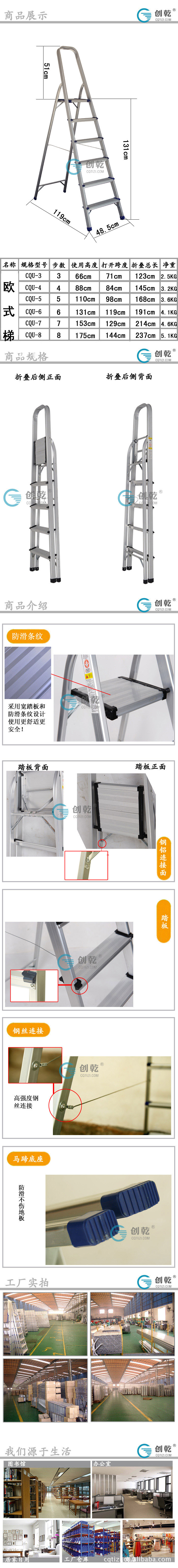 | 描述: | 本款梯为全铝合金结构,支柱为50*20mm的方管显得特别大方结实,承重有120公斤和150公斤二款,取得GS EN131认证,是本司出口量最大的款式之一。以下为1.2mm厚材料的数据. |