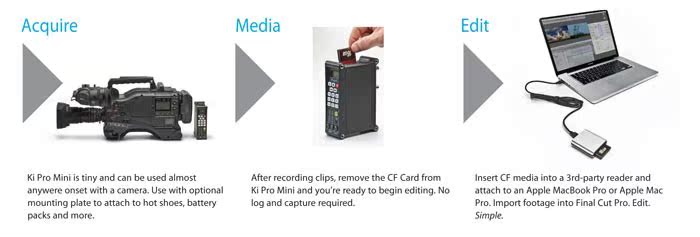 AJA的Ki Pro Mini是一款小巧轻盈,突破性的无带化录像机,Ki Pro已经能直接将摄像机拍摄的画面采集成Apple ProRes422编码的媒体文件了,更便携的的Ki Pro Mini闪存式录像机能更加方便的连接数字摄像机和摄像机配件。小巧不引人注目的空间需要让它能在现场随时随地捕捉摄像机拍摄的画面并转成10bit 4:2:2的数字媒体文件来立即编辑。它天衣无缝的采集10bit数字媒体文件,从镜头到后期仅仅一瞬间的事情!