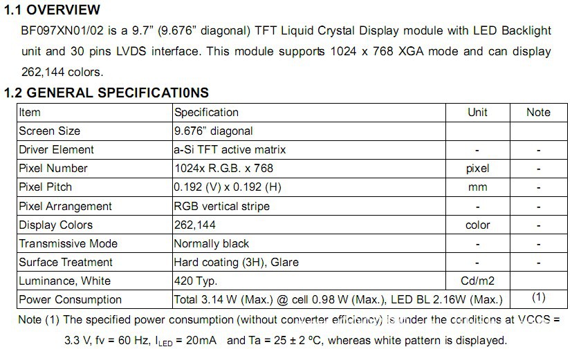 有群创TFT LCM,型号是BF097XN01/02,IPAD用屏,价格面议,详细资料如下(可来电索规格书和驱动程序):