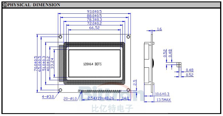 技术参数【产品型号】:BYT12864F 【点 阵 数】:128×64 【外型尺寸】:93.0×70.0×13.5 【视域尺寸】:72.0×40.0 【点 大 小】:0.48×0.48 【点 间 距】:0.52×0.52 【显示模式】:STN(黄绿、蓝、灰)模式,FSTN黑白模式 【显示视角】:6:00视角 【控制芯片】:ST7920 【工作电压】:+5V / +3.3V 【工作温度】:-20℃~70℃ 【储存温度】:-30℃~80℃ |
