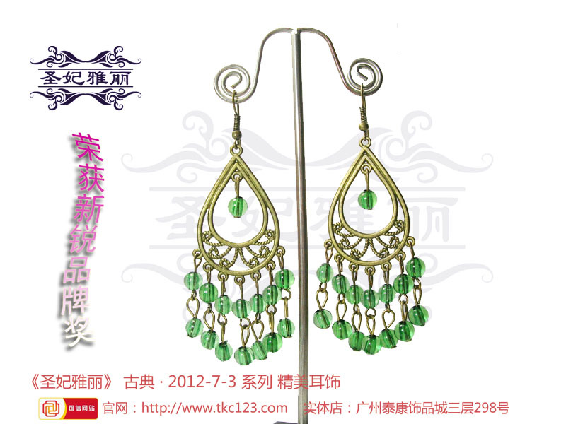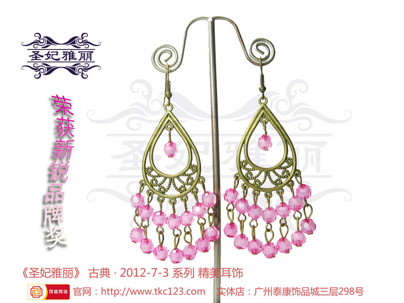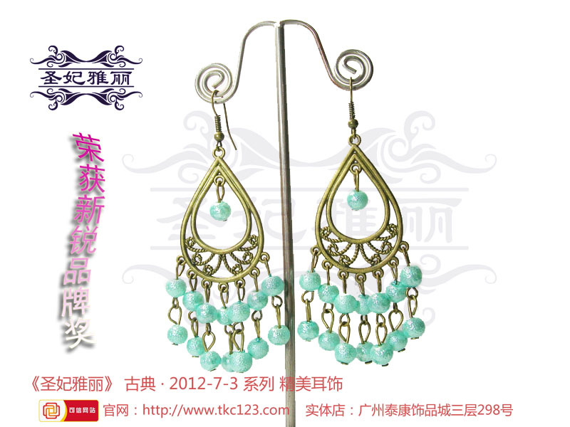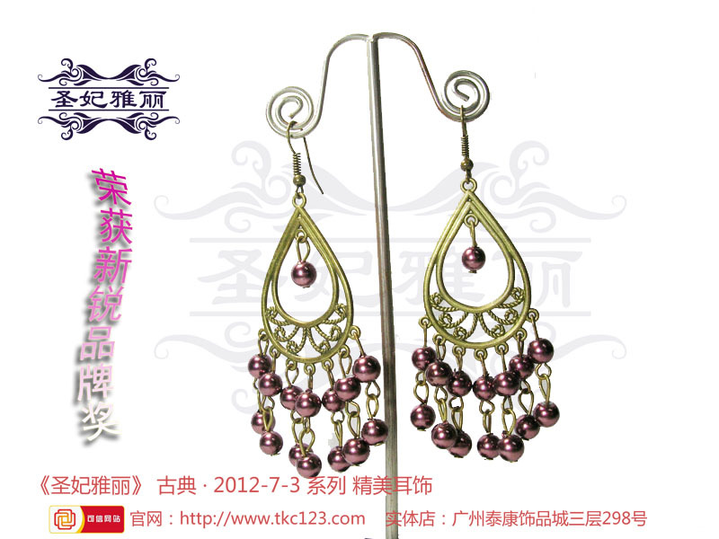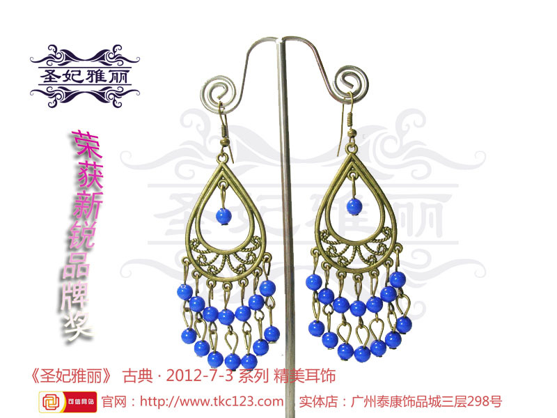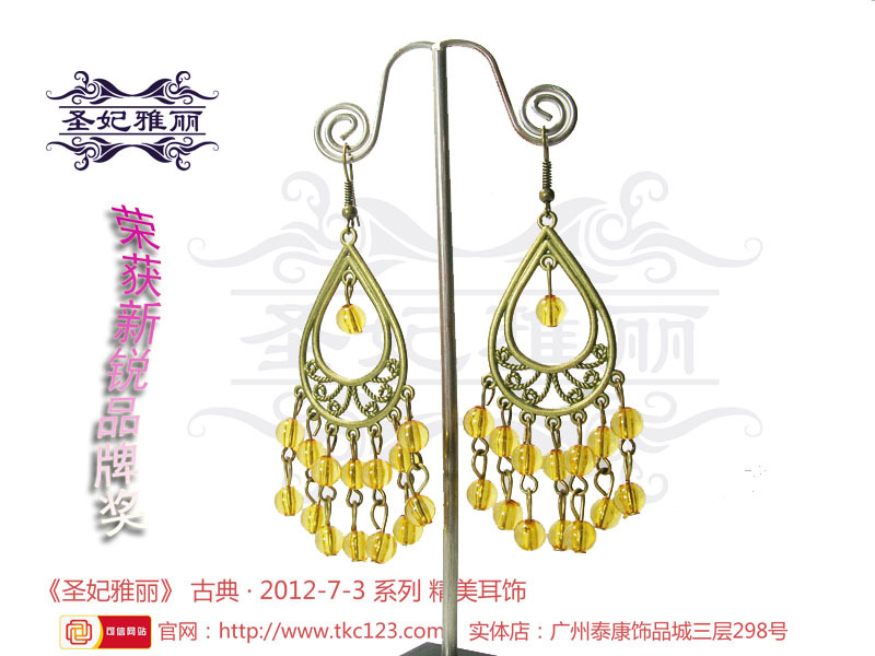 《圣妃雅丽》---随着“中国风”在国际时尚界盛行,圣谊贸易商行推出了以“古典和时尚”合并元素的古典耳环品牌《圣妃雅丽》,传递着它来自古时的讯息,续写着古为今用的古典首饰。纯手工制作,原创设计,集民族、传统特色;异域、潮流时尚风格的《圣妃雅丽》耳环,让每位女性爱不释手,更具女人味 。
