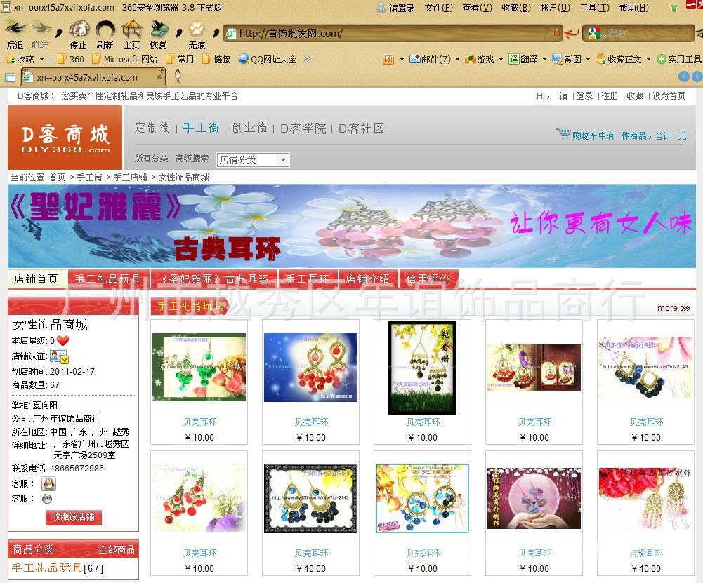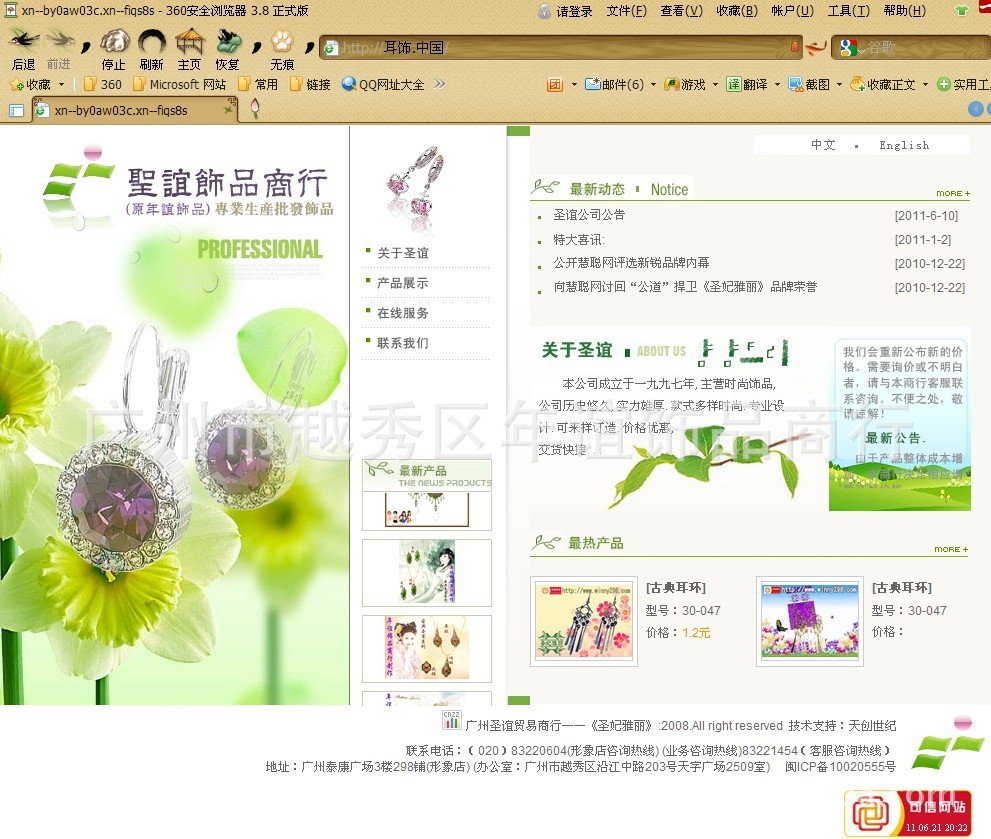 广州市越秀区圣谊贸易商行,是一家坚持走手工制作古典耳环路线的贸易商行,拥有自主创办的《圣妃雅丽》古典耳环品牌。原年谊现已更改为广州圣谊贸易商行,作为坚持走手工制作古典耳环线路供应商,独创品牌《圣妃雅丽》古典耳环,尤以古典耳环产品风格时尚高雅,自然大方,把女性的气质,女人的韵味,成功女士的尊贵,充分展示出来,将女性独特之魅力雕饰至完美无暇.。现拥有30个独立《域名》、6个《通用网址》及《可信网站服务证书》。