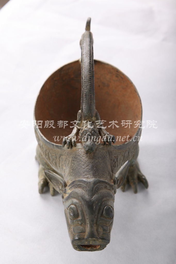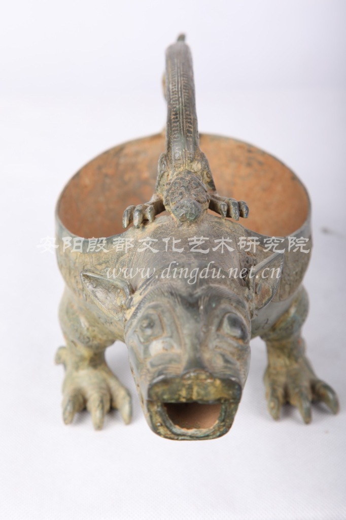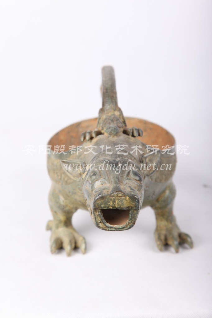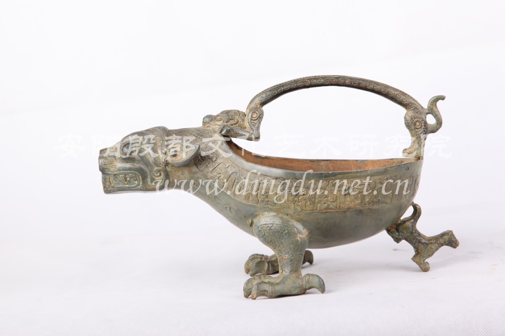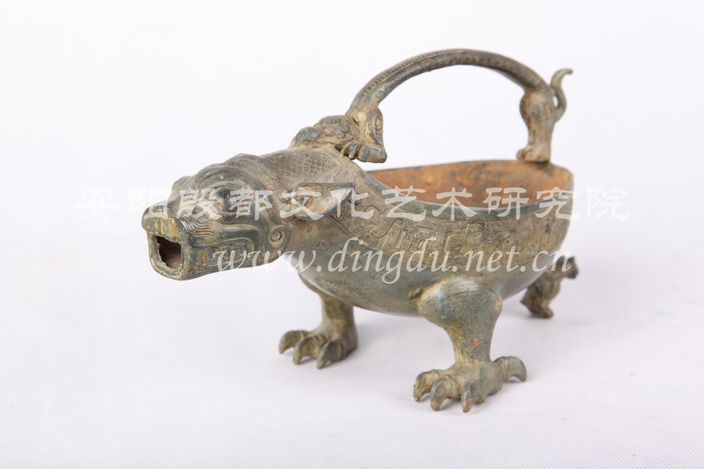 春秋晚期。1988年山西太原金胜村出土,流作咆哮的虎头状。体似圆瓢,深腹,圆底,下承一对有蹼趾的足,尾部下有倒立的小虎支撑,颈部饰蟠龙纹,虎头、提梁、脚蹼都用圆点羽纹、涡纹和鳞纹作填纹。