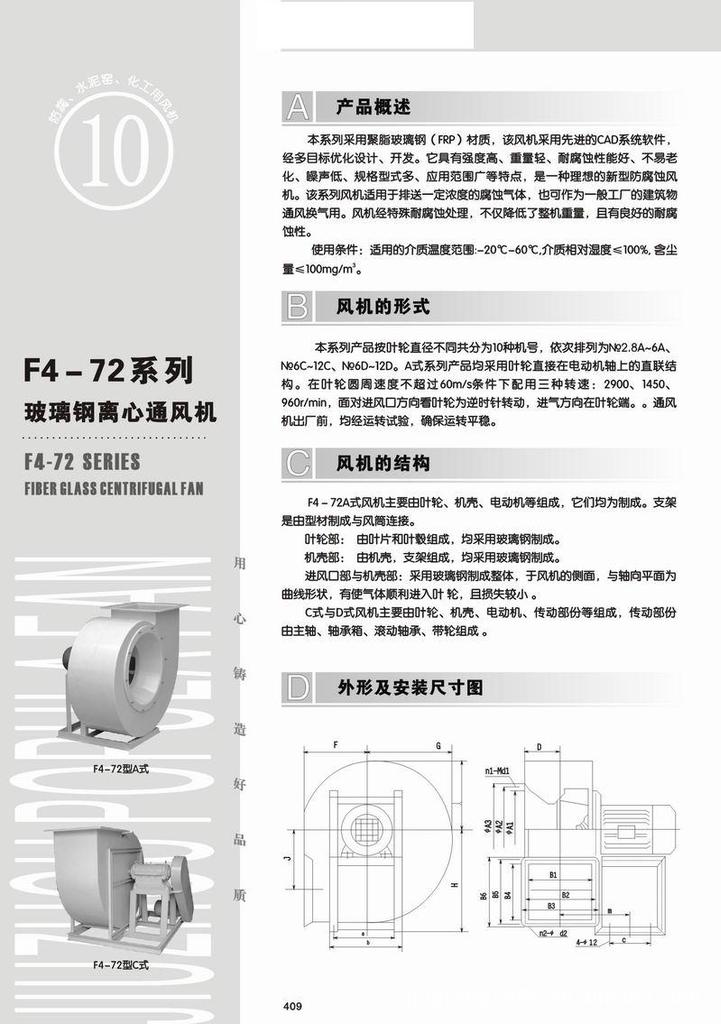 F4-72型玻璃钢离心通风机是参照金属4-72型通风机性参数而采用玻璃钢复合材质制作而成。该系列风机可输送含酸碱成分及化学成分的腐蚀性气体。所输送气体不允许含有粘性物质、所含粉尘及硬质颗粒≤150mg/m3、气体温度≤60℃、相对湿度≤100%.该系列风机具有强度高、重量轻、不易老化、耐腐蚀性能良好、噪音低、运转平稳等特点。是一种较为理想的通用型防腐风机。该系列风机广泛应用于化工、电镀、氧化、发电厂、化验室、线路板、环保设备等含有腐蚀性气体的场所。 BF4-72型玻璃钢防爆离心通风机是根据客户的使用条件配置EXdI或EXdII类A、B等级防爆隔离型电机制作而成.可输送含有甲烷、乙烷、丙烷、苯乙烯、甲苯、二甲苯、一氧化碳、醋酸、煤油、汽油、呋喃等易燃、易爆挥发性气体。其性能参数和安装尺寸与F4-72型玻璃钢离心通风机一致。(B)F4-72(C式)型玻璃钢离心通风机是叶轮采用水冷座或油冷座经角带与电机传动。其好处是减少腐蚀电机、减速、降低电机负荷等作用,从而增加风机使用寿命。ZZZZZZZZZZZZZZZZZZZZZZZZZZZZZZZZZZZZZZZZ