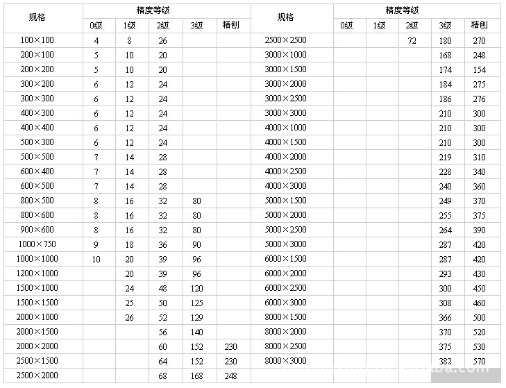 检验平板精度:按国家标准计量检定规程执行,分别为0,1,2,3级四个级别。