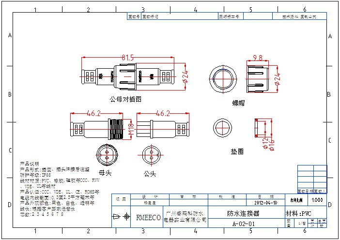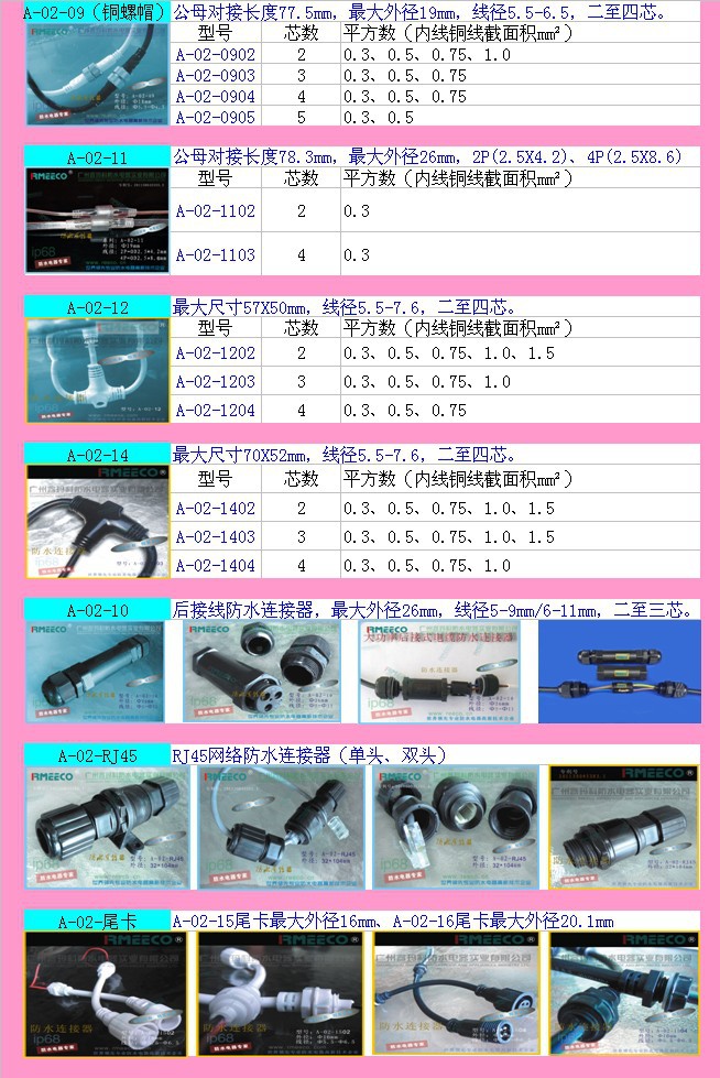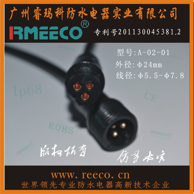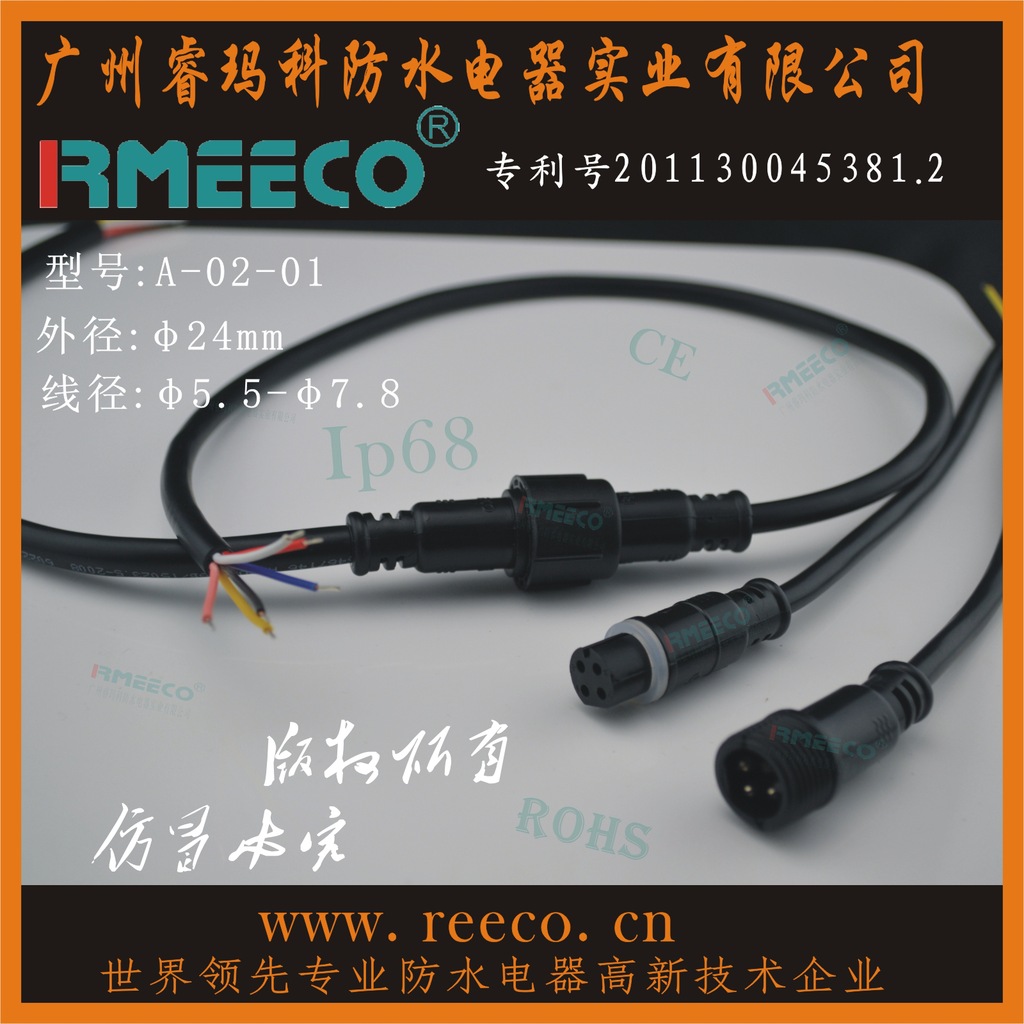 - 线材材质:PVC、橡胶,硅胶其他,根据客户要求定,常规为国标RVV护套线,也欢迎客户来线,由我司加工注塑上防水公母接头