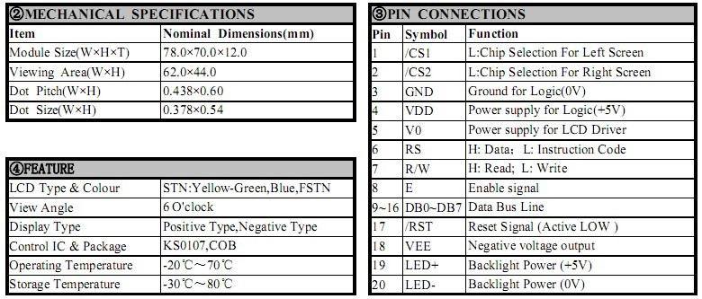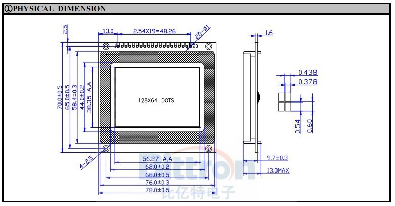 技术参数【产品型号】:BYT12864C 【点 阵 数】:128×64 【外型尺寸】:78.0×70.0×12.0 【视域尺寸】:62.0×44.0 【点 大 小】:0.378×0.54 【点 间 距】:0.438×0.60 【显示模式】:STN(黄绿、蓝、灰)模式,FSTN黑白模式 【显示视角】:6:00视角 【控制芯片】:KS0107及其兼容 【工作电压】:+5V / +3.3V 【工作温度】:-20℃~70℃ 【储存温度】:-30℃~80℃ |