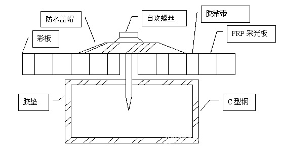 4、采光板固定时,必须使用良好的泛水垫圈,使之介于螺丝与采光板之间,以便于防水防尘。