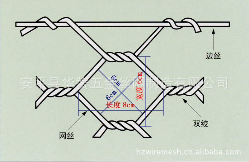 钢丝表面通常还采用热镀锌或PVC/PE保护,镀锌保护层的厚度可根据客户的要求制做,一般在250g/m2以上,使其具有优良的防蚀耐久的品质。PVC/PE保护层将会大大增加网的使用寿命,并且通过不同颜色的选择,使其能和周围的自然环境相融合。笼子的尺寸,可根据实际情况任意选定。常见网孔大多60×80mm,80×100mm,200×250mm。
