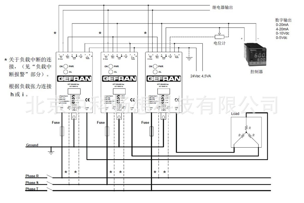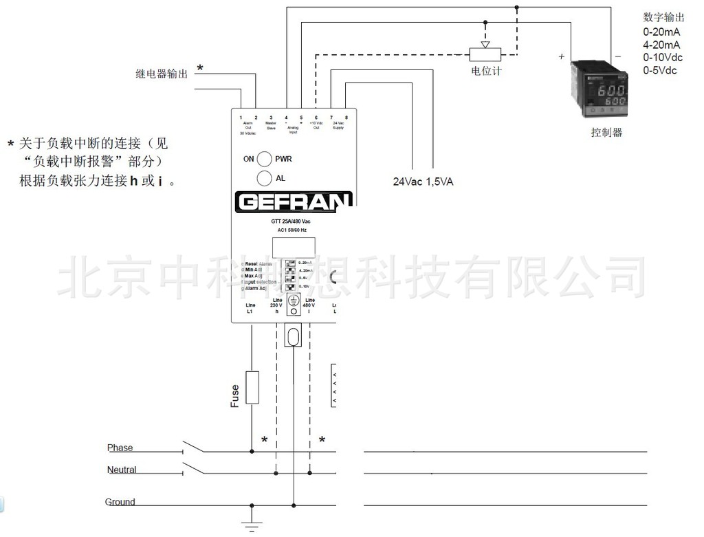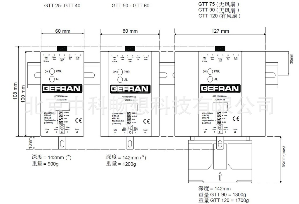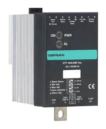 意大利GEFRAN 固态继电器【GTT】又称电源控制器、可控硅等。GEFRAN GTT固态继电器模拟输入信号(0-10V 或0-20/4-20mA)或电位计(从1KΩ到10KΩ)的负载提供了高准确度的控制。 电气设计确保了电源的均衡周期时间能够自动优化。 对于给定的输入信号,计算GTT为负载提供的可能的最小周期数量,以维持必要的准确度。 这确保了1 个快速精确的控制回路,它使由控制器或PLC 驱动的GTT 能够获得精确的控制。 GTT 可被用于3 相系统,采用主从控制结构,控制信号驱动1 个GTT固态继电器(主),而此装置为其它装置(从)提供同步信息。可以提供可选的中断负载监控,它从变流器得到500mAac 的输入。断路点可调,并有LED 指示与1 组常开的无压继电器触点输出。 GTT 有1 个绿色LED 电源指示器和1 个红色转换状态LED 指示器。当电压为0 时,LED 是常闭的。当电压为最大时,LED 是开着的。当电压为不同的中间值时,LED 会闪烁。 提供可选附件用于面板安装,熔丝与熔丝座,变流器与变压器。