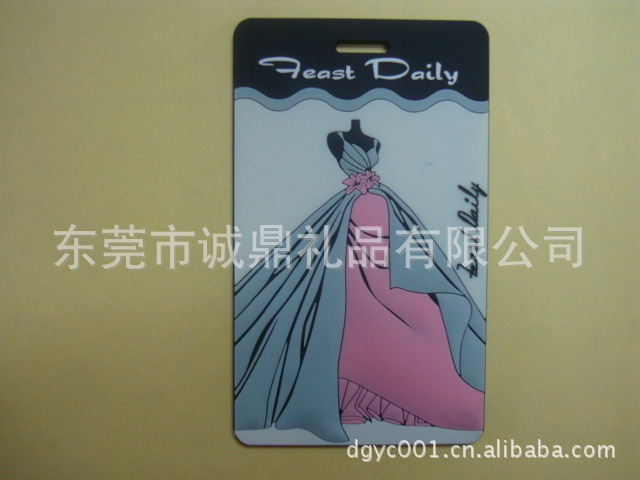 产品具有外表精美,色彩鲜明,轻巧玲珑,立体感强,图案清晰自然,质地柔软,手感好,耐光,耐汗,耐热,耐冻,耐摩擦,防老化,不易磨损等特点,此类产品是由多个部分组合而成,有PVC片材、纸卡、胶框、吊带和软胶牌。