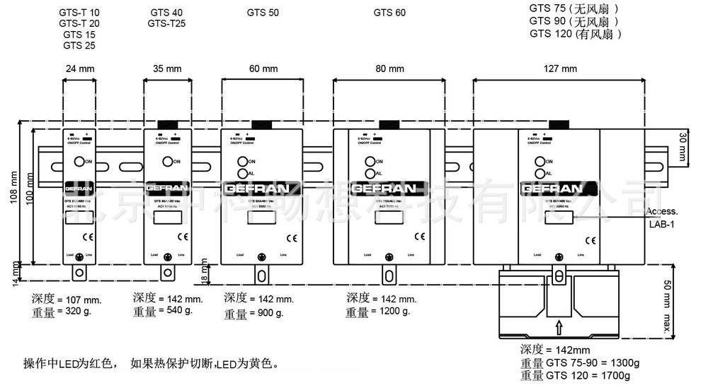 意大利GEFRAN【GTS】固态继电器又称电源控制器、可控硅等。GEFRAN GTT固态继电器负载的导入和导出需要使用一个适当的转换装置和保护装置,它必需是安全的并不受干扰的影响。为了进行精确的控制,许多工业应用要求负载在极短的转换时间内被激活。现行的办法是使用固态继电器。GEFRAN 提供一系列固态继电器-GTS,它们的电流额定值在10A 和120A 之间,标准电流为230Vac 和480Vac。根据负载的类型,可分为Triac型和SC 型。在满电流额定值和环境温度不超过40℃的情况下,所有的型号都保证持续工作。对于不太重要的操作,可以使用比额定值更大的电流(指热消耗曲线)。附件如下:熔丝、熔丝座、DIN轨道连接器。