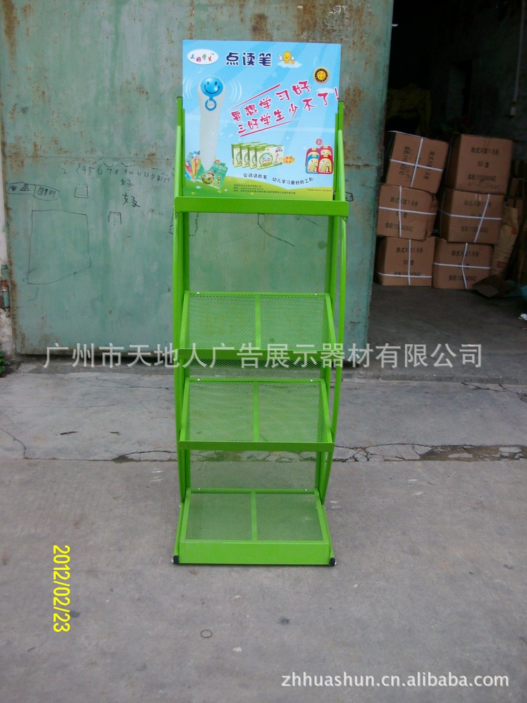 材质:15*25蛋管喷涂绿色,三层线栏喷涂绿色,承重力强,单层可点读机,儿童内衣,食品等等产品展示,高清喷绘背胶过膜裱PVC广告牌;做工精致,焊接位平滑,组装简易,陈列稳定