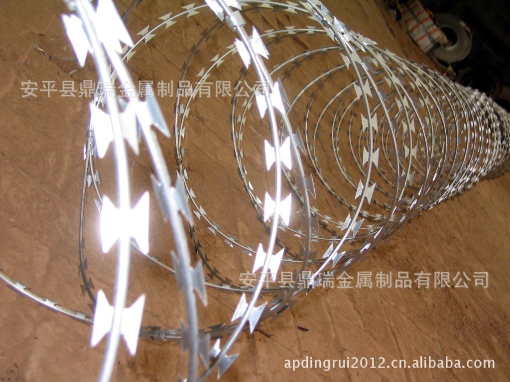 刀片刺绳也称为刀片刺丝、刀片刺网,是一种新型护栏网产品。它具有吓阻效果好、美观、施工便利,经济实用等优异特点。主要用于园林公寓,机关单位,监狱,哨所,边防等的圈禁防护。刀片刺网由热镀锌钢板或不锈钢薄板冲压出尖锐的刀片状,高张力镀锌钢丝或者不锈钢丝做芯线组合而成的阻绝器材。由于刺网造形独特不易触摸,因而能达到极好的防护隔离效果。产品的主要材质有镀锌板和不锈钢板。