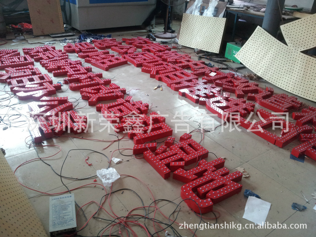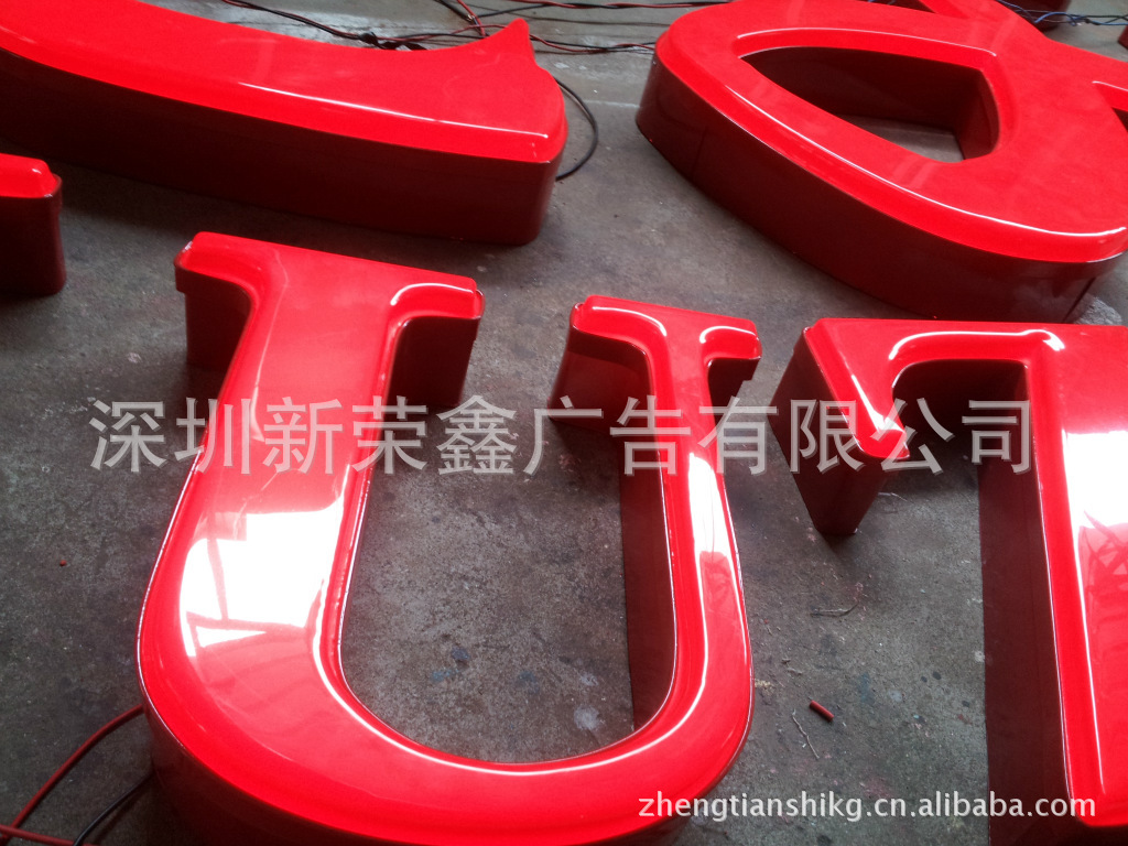 吸塑字也是一种发光字,板面通常使用亚克力板吸塑成型,再由底座等组合而成。其内部置入LED灯或是高压灯,表面工艺有平面、平鼓、球鼓、棱鼓等形式,箱体材料有铁皮烤漆、铝型材、不锈钢、钛金等,字面色彩既可以是固有色板,也可以是专色或四色丝印。