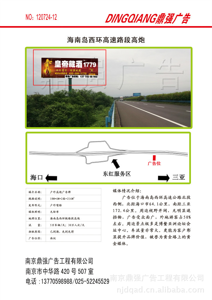 南京鼎强广告工程有限公司成立于2003年,专业致力于设计、制作、发布、代理国内各类广告,户外、高炮广告为一体的综合性公司。公司在南京市区、机场高速、沪宁高速、沪杭高速、宁杭高速、宁合高速、宁六高速、G104国道、大桥、二桥等交通要道有户外媒体。合作单位涉及金融业、建材业、酒业和房地产业等。公司具备多年大型户外广告发布的经验,提供专业和完善的售后服务,业务遍及江苏、浙江、安徽、上海等地。我们擅长运用高新科技,从客户需求及传播效果出发,整合并创造新概念户外媒体,以提供从“精准策略-犀利创意设计”至“完美制作-有效执行发布”,客户满意率达95%以上。