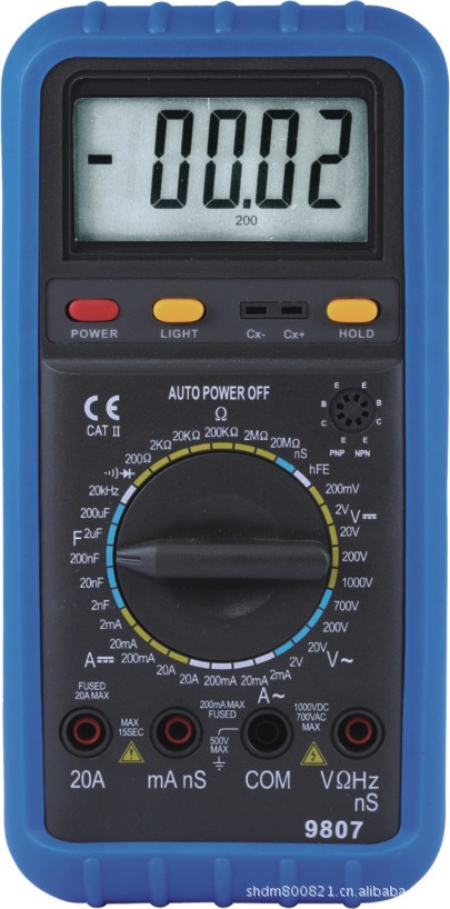 显示位数 19999量程选择 手动量程二极管测试 √三极管测试 √通断蜂鸣 √数据保持 √背光照明 √电导测量 0.1ns~100ns自动关机 √
