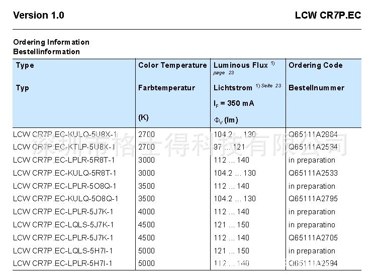 代理供应新款高LM 高显指,欧司朗OSRAM LCW CR7P 原包装暖白,自然白 优质大功率LED白光,亮度:90-150LM,色温:2700-5000K,电压:2.8-3.25V,色温250K分档,电流:350-700MA,角度80度,原装正品,品质稳定,衰减小,一致性好,无色差,亮度均匀,寿命长.适用范围:LED灯具,LED车灯,LED照明,等。 质量保证,价格优惠!欢迎各界朋友咨询、购买!期待与您合作!有需要的请联系我. 龚建东,13316857292 QQ:1661048499
