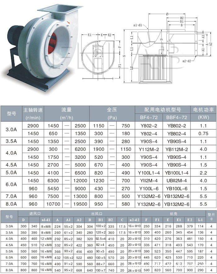 F4-72型玻璃钢离心通风机是参照金属4-72型通风机性参数而采用玻璃钢复合材质制作而成。该系列风机可输送含酸碱成分及化学成分的腐蚀性气体。所输送气体不允许含有粘性物质、所含粉尘及硬质颗粒≤150mg/m3、气体温度≤60℃、相对湿度≤100%.该系列风机具有强度高、重量轻、不易老化、耐腐蚀性能良好、噪音低、运转平稳等特点。是一种较为理想的通用型防腐风机。该系列风机广泛应用于化工、电镀、氧化、发电厂、化验室、线路板、环保设备等含有腐蚀性气体的场所。 BF4-72型玻璃钢防爆离心通风机是根据客户的使用条件配置EXdI或EXdII类A、B等级防爆隔离型电机制作而成.可输送含有甲烷、乙烷、丙烷、苯乙烯、甲苯、二甲苯、一氧化碳、醋酸、煤油、汽油、呋喃等易燃、易爆挥发性气体。其性能参数和安装尺寸与F4-72型玻璃钢离心通风机一致。(B)F4-72(C式)型玻璃钢离心通风机是叶轮采用水冷座或油冷座经角带与电机传动。其好处是减少腐蚀电机、减速、降低电机负荷等作用,从而增加风机使用寿命。