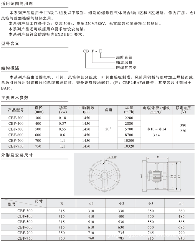 CBF(BAF)系列厂用隔爆型防爆轴流风机系列产品由防爆电机、风叶、风筒等部分组成,叶片由铝板制成,风筒用钢板与型材加工焊接而成,电源引线用钢管布线和电缆布线均可,壳外设有接地螺钉. (注:CBF为BAF改进型,其安装尺寸等同于BAF)。技术参数:四、主要技术参数产品型号 直径(mm) 功率(KW)主轴转速rpm CBF-300 300 0.18 1450CBF-400 400 0.37 1450CBF-500 500 0.55 1450CBF-600 600 0.75 1450外形及安装尺寸型号尺寸 B ф1 ф2 ф3 ф4CBF-300 315 310 330 350 380CBF-400 315 410 400 450 485CBF-500 315 510 530 550 585CBF-600 315 610 630 650 695CBF-700 350 710 735 765 790